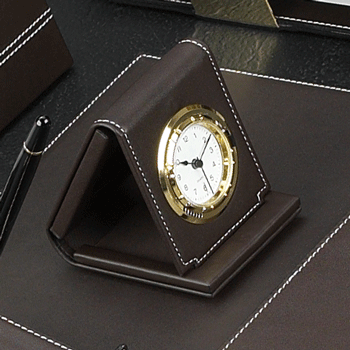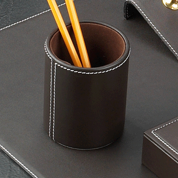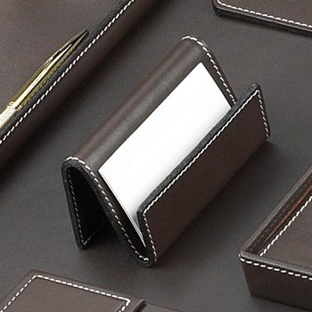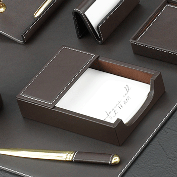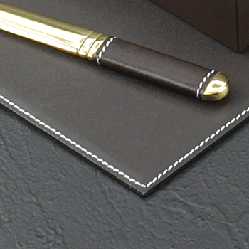 Brown leather desk pad and accessories. Gold-Plated Brass Accents. White Contrast Stitching.